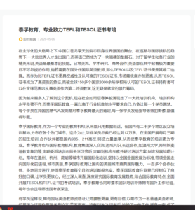 TESOL全称(Teachers of English to Speakers of Other Languages)即对以英语为第二语言的学生进行英语教学的国际英语教师资格证书,被国际上100多个国家的7000多学校认可,它代表了英语教学的职业技能国际标准,包括从学士到博士等不同级别的学位课程,是研究英语教育理论与方法的专业领域,由国际英语教育研究协会认证并颁发。报名条件中国大学、中小学英...